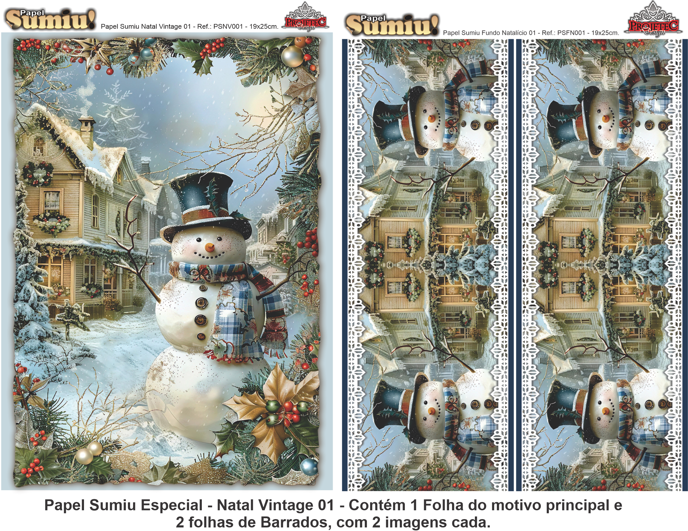 PAPEL SUMIU Especial – Natal Vintage 001 – REF.: PSNV001 – PACK C/3 Folhas 19x25cm